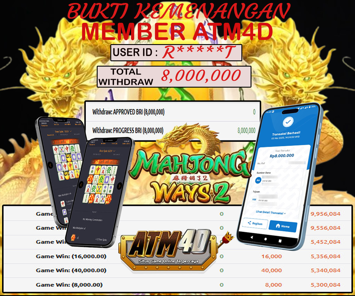 Jangan lewatkan kesempatan untuk meraih kemenangan besar. Daftar sekarang di ATM4D dan rasakan pengalaman bermain slot terbaik yang pernah ada! Putar gulungan, menangkan jackpot, dan jadilah bagian dari komunitas pemain sukses kami!