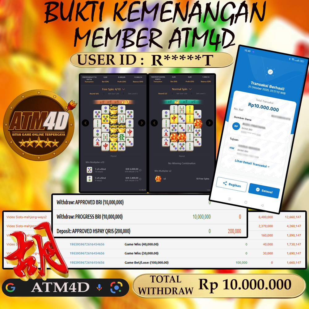Jangan lewatkan kesempatan untuk meraih kemenangan besar. Daftar sekarang di ATM4D dan rasakan pengalaman bermain slot terbaik yang pernah ada! Putar gulungan, menangkan jackpot, dan jadilah bagian dari komunitas pemain sukses kami!